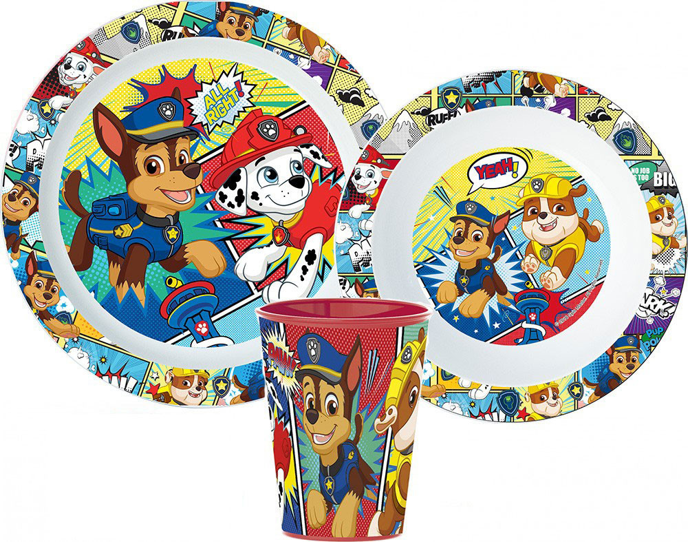 Mancs Őrjárat Comic étkészlet, micro műanyag szett, pohárral 260 ml